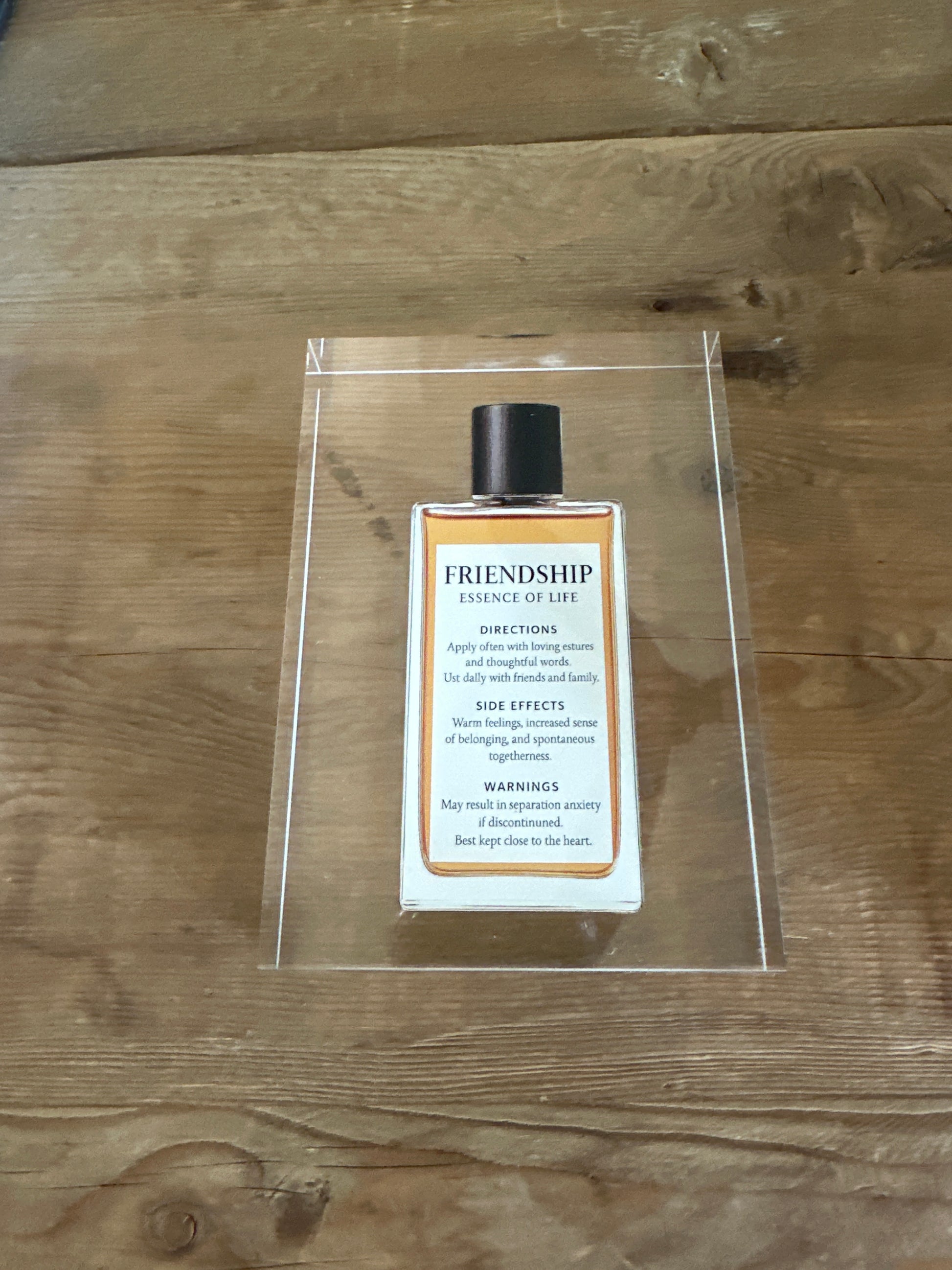 Celebrate the beauty of connection with our FRIENDSHIP – Essence of Life centerpiece. Designed like a vintage perfume bottle, it’s a heartfelt reminder that love and kindness are the true essence of life. Elegant, witty, and full of meaning — this acrylic block makes the perfect gift for your best friend, a loved one, or even yourself. A timeless piece that warms any space with emotion and charm.