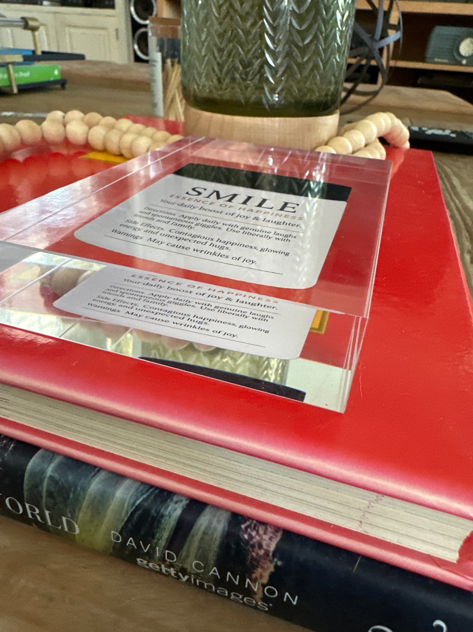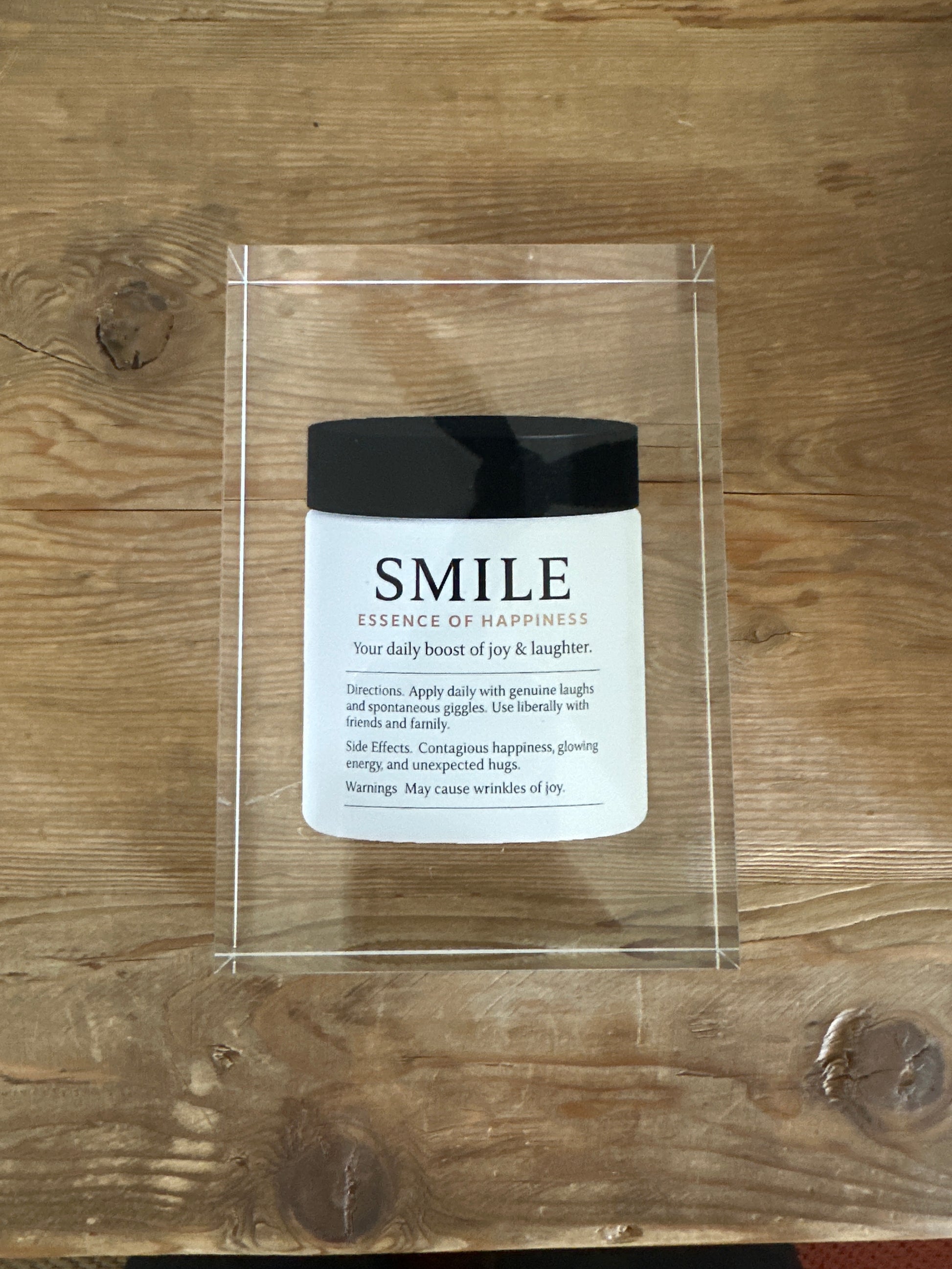 Add a daily dose of joy to your space with our SMILE – Essence of Happiness centerpiece. Designed like a chic jar of happiness, this playful acrylic block reminds you that laughter really is the best medicine. Perfect as a gift or décor accent for your home, office, or vanity — it’s modern, witty, and guaranteed to spark smiles.